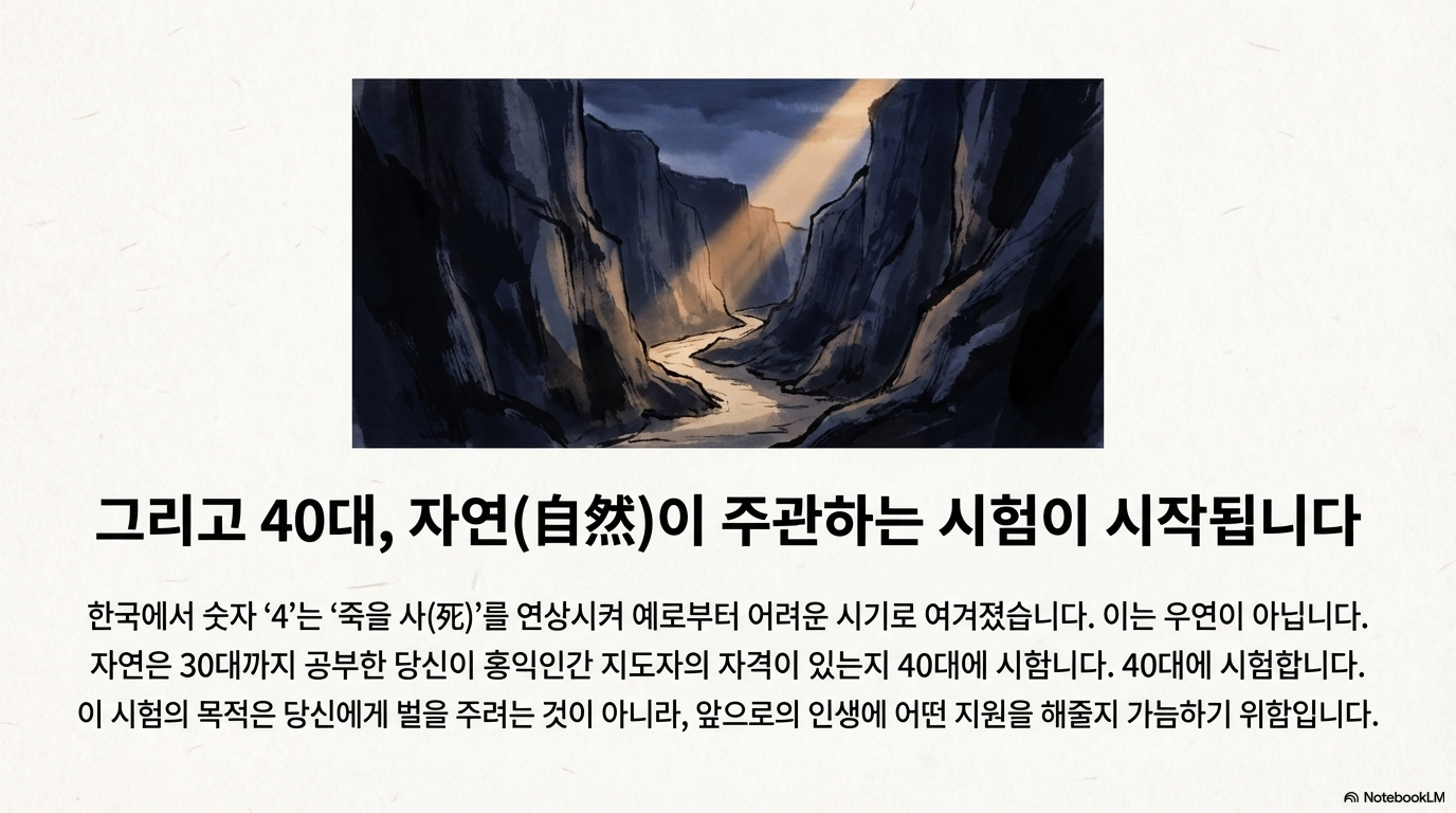 결론적으로, 대한민국 40대에게 '사(4)' 자는 단순한 숫자가 아니라, 지난날의 공부를 검증받고 진정한 어른으로 다시 태어나기 위해 반드시 거쳐야 하는 자연의 엄격한 테스트 구간을 의미합니다. 이 시기를 두려워하기보다는 자신의 내면을 갖추고 환경을 흡수하는 실력을 증명함으로써, 50대 이후의 빛나는 삶을 지원받는 기회로 삼아야 합니다.