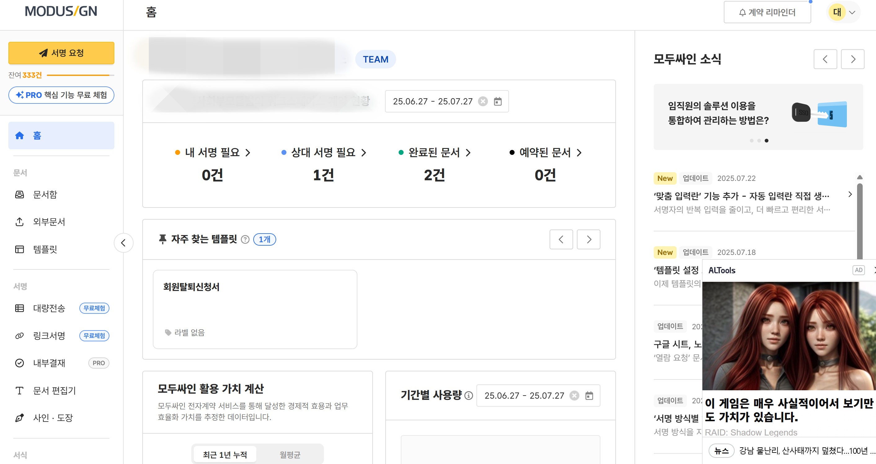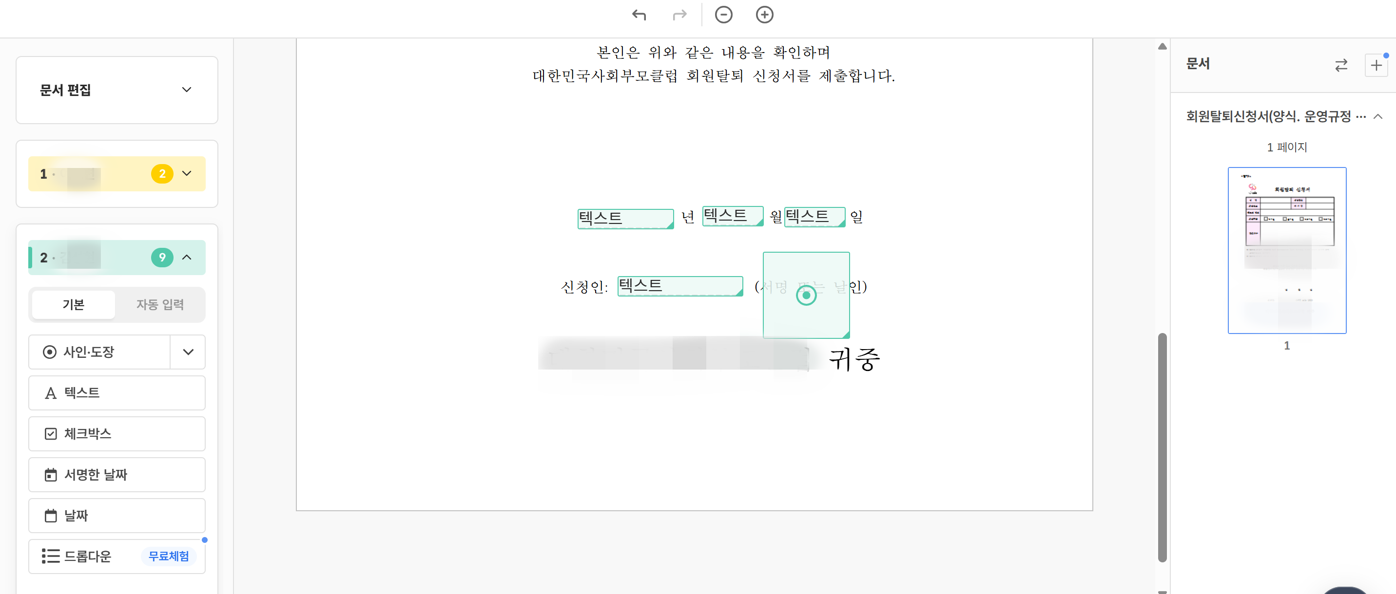 다음으로 사인도장을 선택해 필요한곳에 사인 또는 도장의 기록할수 있는 칸을 만들어 준다. 결재자가 2인 이상일 경우 추가하여 결재 단계를 만들어 준다.