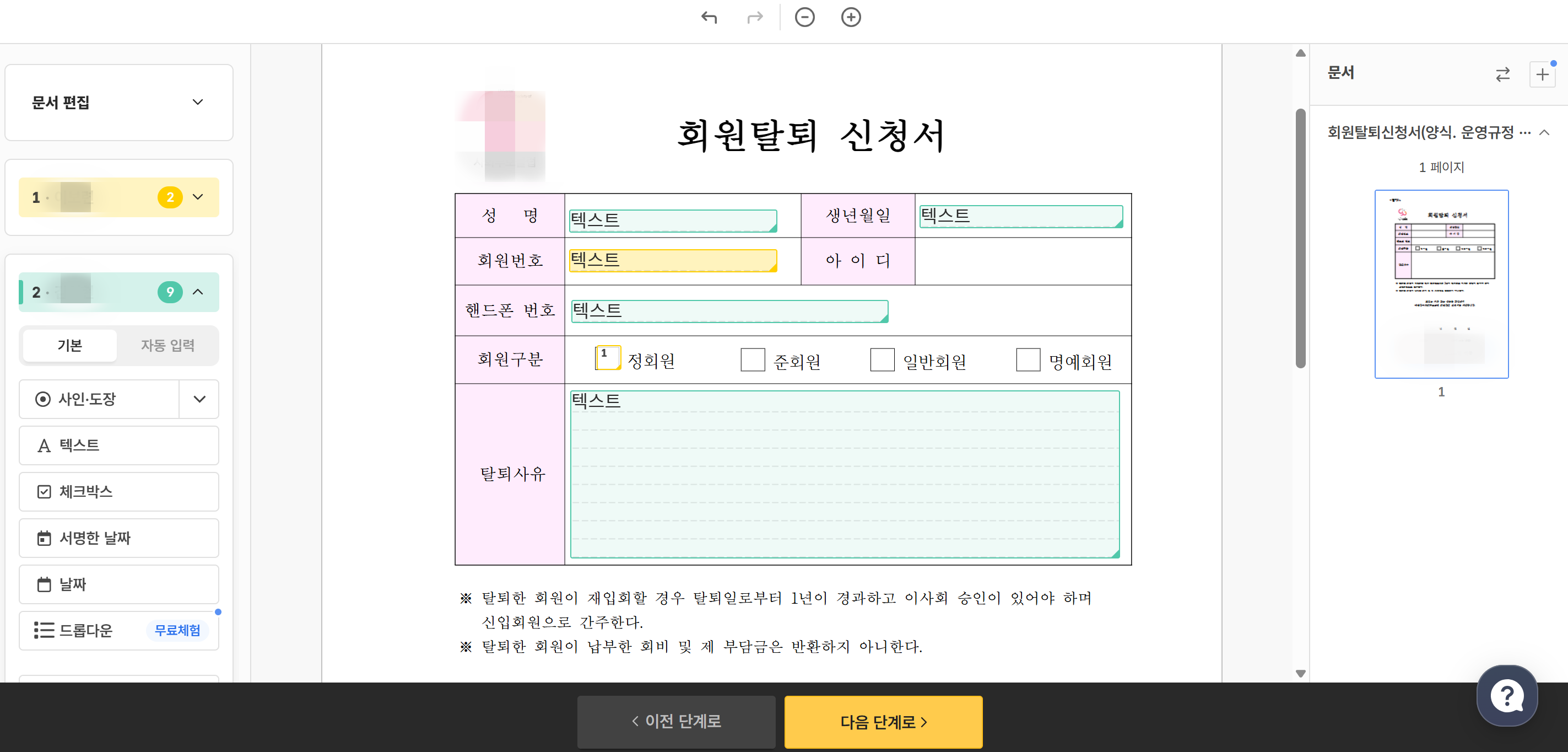 4. 문서편집을 선택해 미리 회원번호나 정회원과 같은 고정값은 입력을 하면 노란색으로 박스가 표시가 된다.