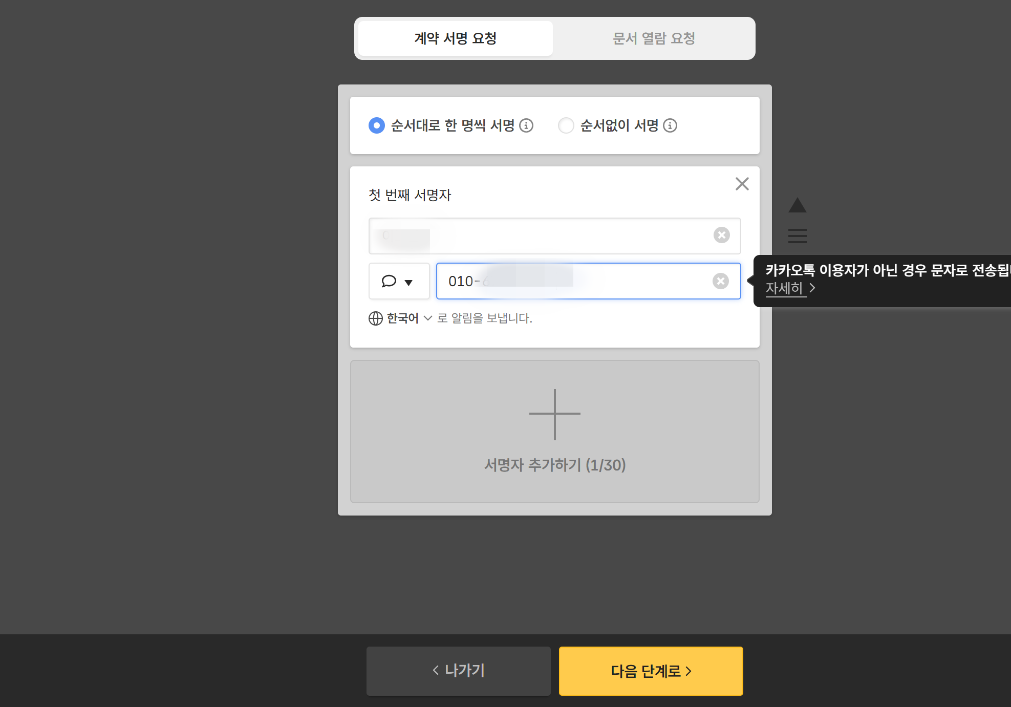 5. 보낼 사람은 카톡, 이메일, 문자를 선택할수 있데 되어 있다. 카특을 선택해 전화번호를 입력해준다. 결재할 모든 인원을 추가하여 결재라인을 만든다. 예를들면 담당 -> 이사 -> 대표이사 등의 순서로 회사의 조직체계에 맞게 설정한다.