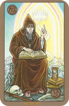 카드를 지배하는 갈색과 회색은 현실성, 안정감, 인내, 그리고 진중함을 상징합니다. 뒤편의 노란색 빛은 내면의 지혜와 깨달음을, 푸른색 하늘은 명확한 사고를 의미해요.