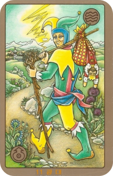 카드를 지배하는 밝은 노란색과 초록색은 자유, 희망, 새로운 시작, 그리고 활력을 상징합니다. 붉은색과 푸른색의 광대 옷은 다채로움과 예측 불가능한 성격을 나타내며, 하늘의 번개는 갑작스러운 영감이나 변화를 암시해요.