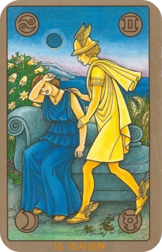 숫자 15는 종종 '악마' 카드의 번호이기도 한데, 여기서는 '감정의 억압'이나 '소통의 어려움'이라는 내면의 그림자에 갇힐 수 있음을 암시합니다. 하지만 동시에 그 그림자를 직시하고 해방될 수 있는 가능성도 내포하죠. 카드의 상단 왼쪽에는 게자리(♋) 심볼, 상단 오른쪽에는 쌍둥이자리(♊) 심볼이 선명하게 보이시죠?