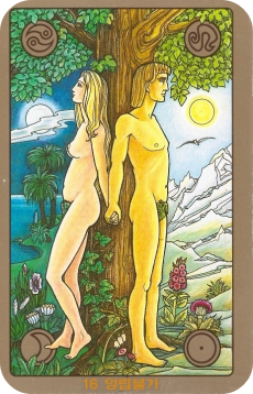 중앙의 나무를 중심으로 왼쪽은 밤하늘과 달, 호수가 있는 감성적인 풍경(여성/음의 에너지)이, 오른쪽은 낮과 태양, 산이 있는 이성적인 풍경(남성/양의 에너지)이 대조를 이룹니다. 남녀는 서로 등을 돌린 채 서 있지만, 손은 맞잡고 있어 '함께하지만 따로'인 관계의 본질을 보여줍니다.