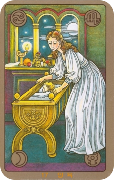 카드를 지배하는 푸른색과 흰색은 순수함, 평화, 그리고 섬세한 감정을 상징합니다. 노란색 아기 요람은 소중함과 따뜻함을, 뒤편의 초록색 나무와 달빛은 평화롭고 안정적인 환경을 의미해요.