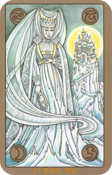 카드를 지배하는 흰색과 푸른색, 그리고 회색은 차가움, 고독, 순수함, 그리고 감정적인 얼어붙음을 상징합니다. 배경의 노란색 태양과 성은 그녀가 무의식적으로 추구하는 '따뜻함'이나 '인정'에 대한 욕구를 암시할 수 있습니다.