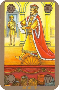 카드를 지배하는 황금색과 붉은색은 권위, 열정, 활력, 그리고 화려한 자기 표현을 상징합니다. 푸른색과 보라색 옷은 창의성과 지적인 깊이를 더하며, 무대와 같은 배경은 주목받는 환경을 나타냅니다.