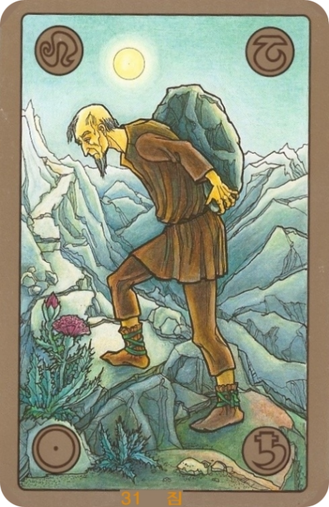 색깔: 카드를 지배하는 갈색과 회색은 짐의 무게, 현실의 어려움, 그리고 고독을 상징합니다. 뒤편의 푸른색 하늘과 태양은 희망과 내면의 빛을 의미하며, 척박한 산악 지형은 험난한 여정을 나타냅니다.