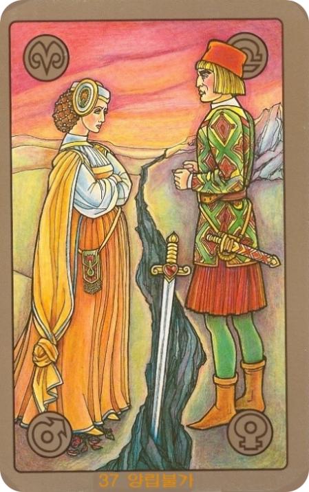 36번 '죄책감' 카드에서 완벽주의적 자책과 억압된 행동으로 인한 고뇌를 이야기 나눴죠. 오늘은 심볼론 타로 행성 카드의 또 다른 핵심, 우리 내면의 '근본적인 불일치'와 '관계 속의 날카로운 분열'에 대한 이야기를 해볼 시간입니다. 깊은 틈이 갈라져 있고, 그 사이에 칼이 박혀 있는 두 남녀처럼, 때로는 서로를 향하지만 결코 하나 될 수 없는 듯한 모순을 느낄 때가 있죠. 💔⚔️