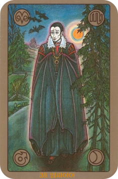 색깔: 카드를 지배하는 어두운 푸른색, 검은색, 붉은색은 어둠, 신비로움, 위험, 그리고 강렬한 욕망을 상징합니다. 흡혈귀의 창백한 얼굴은 생명력의 고갈과 그림자 같은 존재를 나타내며, 하늘을 나는 박쥐들은 어두운 분위기를 더욱 고조시킵니다.