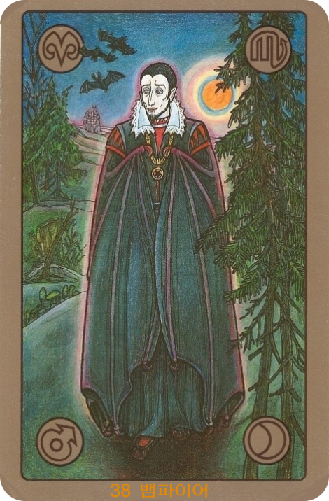 색깔: 카드를 지배하는 어두운 푸른색, 검은색, 붉은색은 어둠, 신비로움, 위험, 그리고 강렬한 욕망을 상징합니다. 흡혈귀의 창백한 얼굴은 생명력의 고갈과 그림자 같은 존재를 나타내며, 하늘을 나는 박쥐들은 어두운 분위기를 더욱 고조시킵니다.