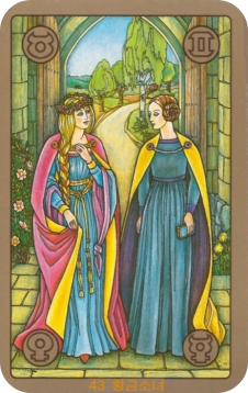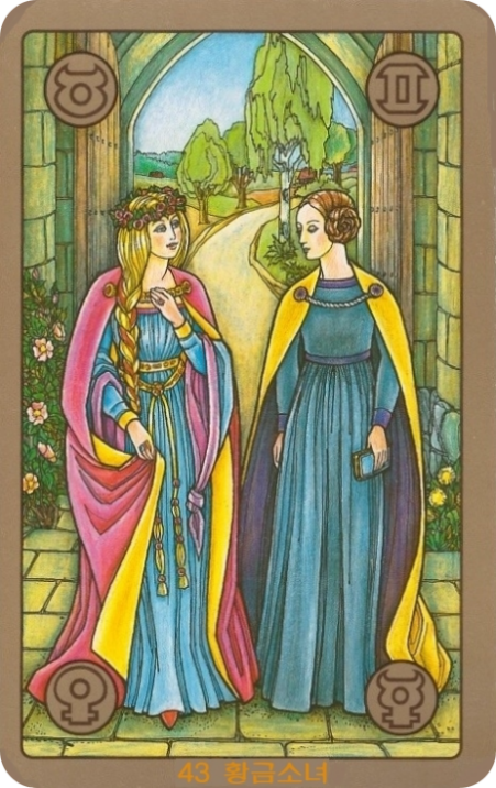 카드를 지배하는 금색과 푸른색, 그리고 분홍색은 지혜, 순수함, 조화, 그리고 아름다움을 상징합니다. 두 소녀의 화려하면서도 단아한 옷차림은 내면의 가치와 외면의 아름다움이 조화를 이룸을 나타냅니다. 아치형 문과 정원은 새로운 기회와 풍요로운 관계를 암시합니다.