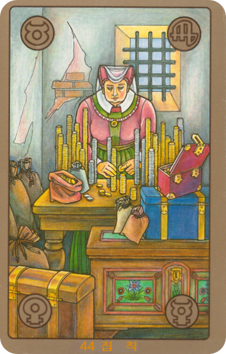 43번 '황금 소녀' 카드에서 아름다운 소통과 지혜로운 선택을 이야기 나눴죠. 오늘은 심볼론 타로 하우스 카드의 또 다른 핵심, 우리 내면의 '지나친 소유욕'과 '물질에 대한 집착'에 대한 이야기를 해볼 시간입니다. 수많은 돈더미에 둘러싸여 그것들을 세고 있는 여인처럼, 때로는 우리의 삶이 물질적인 것에 얽매여 진정한 가치를 잃을 때가 있죠.