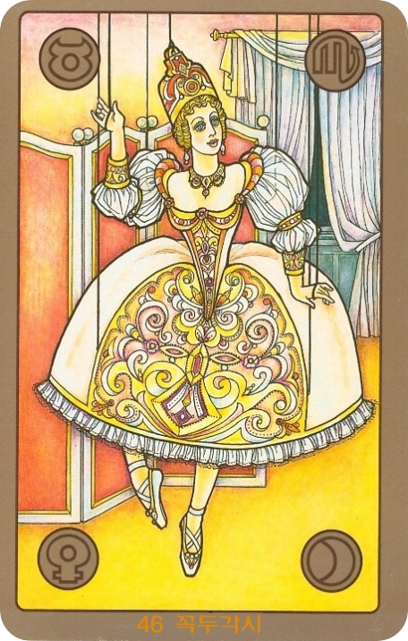 카드를 지배하는 노란색과 붉은색, 그리고 어두운 배경은 화려함 뒤에 숨겨진 위험과 조종을 상징합니다. 꼭두각시의 옷차림은 아름답지만, 수많은 실에 묶여 있어 자유롭지 못한 현실을 극명하게 대비시킵니다.