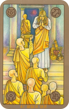카드를 지배하는 황금색은 물질적 풍요와 영적인 빛을 동시에 상징하며, 푸른색과 붉은색의 대조는 영성과 현실, 혹은 이상과 고뇌 사이의 갈등을 나타냅니다. 수도승들의 옷은 순수함과 헌신을, 뒤편의 붉은 달(혹은 태양)은 심오한 깨달음을 암시합니다.