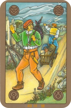 카드를 지배하는 갈색과 녹색은 익숙한 환경과 성장을 상징하지만, 붉은색과 주황색 옷은 변화와 새로운 시작을 위한 강렬한 에너지를 나타냅니다. 뒤편의 어두운 하늘과 밝게 빛나는 하늘의 대조는 과거와 미래, 불안과 희망 사이의 감정을 표현합니다.
