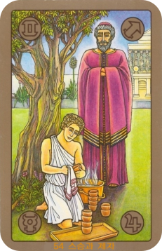 이 '스승과 제자' 카드를 보면 딱 떠오르는 신화 속 인물들은 '중개자' 카드에서 만났던 '신들의 전령' 헤르메스(Hermes, 수성)와 '설교자' 카드에서 만났던 '최고 신이자 행운과 확장의 신' 제우스(Zeus, 목성)의 조합입니다. 헤르메스는 언변, 학습, 정보 교환, 지성을 관장하며, 제우스는 지혜, 확장, 정의, 그리고 높은 이상을 상징합니다.