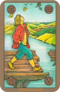 카드를 지배하는 밝은 푸른색과 노란색은 희망, 자유, 지성, 그리고 혁신을 상징합니다. 붉은색 옷은 내면의 활력과 열정을 나타내며, 뒤편의 자연 풍경은 광활한 가능성의 세계를 의미합니다.