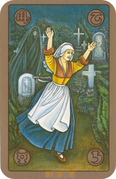 카드를 지배하는 어두운 녹색과 갈색, 푸른색은 침울함, 어둠, 그리고 불안감을 상징합니다. 여인의 노란색 옷은 지성과 활력을 나타내지만, 그의 표정은 극심한 공포에 질려 있어 대비됩니다. 밤하늘과 무덤가는 두려움을 극대화합니다.