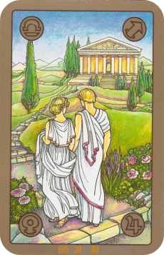 카드를 지배하는 푸른색과 녹색은 평화, 성장, 자연, 그리고 영적인 고요함을 상징합니다. 흰색과 노란색 옷은 순수함, 지혜, 그리고 희망을 나타내며, 멀리 보이는 신전은 숭고한 이상과 진리를 의미합니다.