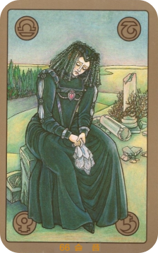 카드를 지배하는 어두운 녹색과 회색은 슬픔, 고독, 현실의 무게를 상징합니다. 여인의 검은 옷과 창백한 얼굴은 깊은 비애를 나타내며, 배경의 부서진 조각상과 메마른 나무는 상실과 절망감을 강조합니다.