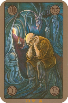 카드를 지배하는 어둡고 탁한 푸른색과 갈색, 검은색은 절망, 고독, 침울함, 그리고 어둠을 상징합니다. 고뇌하는 인물과 동굴 속의 어두운 풍경은 깊은 우울감과 갇힘을 시각적으로 보여줍니다.