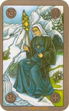 카드를 지배하는 어두운 푸른색, 회색, 흰색은 고독, 침묵, 운명의 냉혹함, 그리고 영적인 고요함을 상징합니다. 여인의 옷차림은 엄숙하고 고요하며, 주변의 눈 덮인 산과 흐르는 물은 시간의 흐름과 인내를 의미합니다.