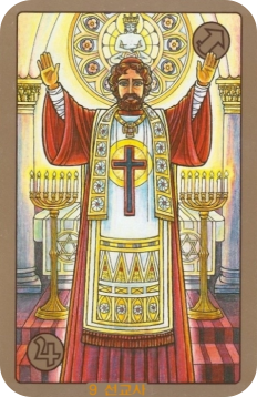 카드를 지배하는 황금색과 노란색은 지혜, 영적인 깨달음, 진리, 그리고 낙천주의를 상징합니다. 붉은색과 흰색의 제복은 신성한 권위와 순수함을 나타내고, 푸른색은 넓은 시야와 정신적인 고양을 의미해요.
