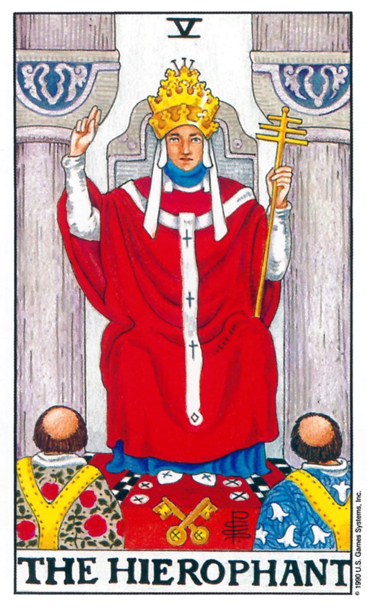 배경/풍경: 교황 뒤로 보이는 두 개의 기둥은 솔로몬 성전의 기둥으로, 지혜와 힘을 상징해요. 카드 하단에는 두 명의 신도가 무릎을 꿇고 있는데, 이는 가르침을 겸허히 받아들이는 모습을 보여줍니다. 그들의 옷에 그려진 장미와 백합은 각각 열정과 순수함을 의미하며, 이들이 신성한 지혜를 갈망하고 있음을 나타내요.