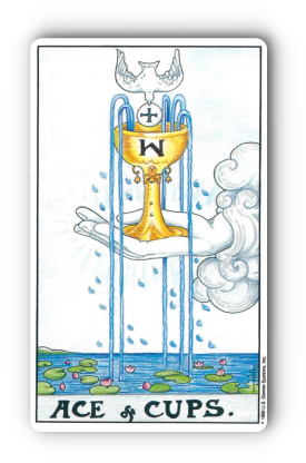 컵 1번, 즉 '에이스 오브 컵스(Ace of Cups)'는 타로 카드 중에서도 가장 아름답고 희망찬 카드 중 하나예요. 그림을 자세히 보면, 구름 속에서 뻗어 나온 손이 컵을 들고 있고, 그 컵에서는 다섯 줄기의 물이 콸콸 넘쳐흐르고 있죠? 그리고 그 위로는 평화의 상징인 비둘기가 성찬식을 상징하는 빵 조각을 물고 있답니다. 컵 아래 연못에는 연꽃들이 피어 있고요.