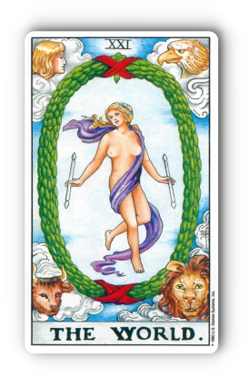 "월드 카드는 타로의 22장 메이저 아르카나 중 가장 마지막 번호인 21번을 차지하고 있습니다. 이 카드는 긴 여정의 끝, 즉 완성과 성취, 그리고 무한한 가능성을 상징합니다. 그림을 자세히 보시면 중앙에 한 여인이 춤을 추고 있고, 그 주위를 커다란 월계관이 감싸고 있지요? 이 월계관은 승리와 영광을 의미하며, 모든 것이 완벽하게 통합되었음을 나타냅니다."