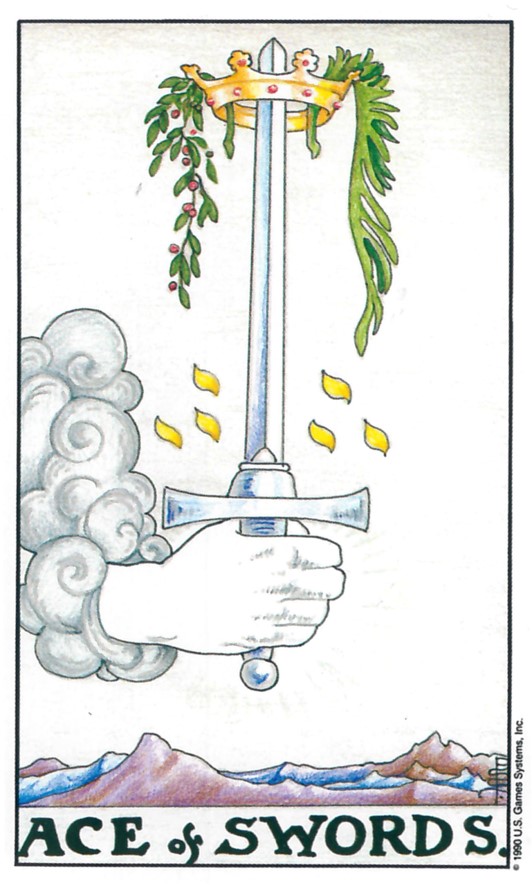 숫자/상징: '에이스(Ace)'는 숫자 1을 의미하며, 새로운 시작, 기회, 잠재력을 상징해요. 검은 정신, 지성, 논리, 진실, 갈등을 나타내는 슈트랍니다. 칼 위에는 왕관이 씌워져 있는데, 이는 승리, 성공, 권력, 그리고 고귀한 목적을 상징해요. 왕관에 걸려 있는 초록색 월계수 잎은 영광과 승리를, 빨간색 열매는 풍요와 생명력을 의미하죠.