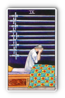 검 9번 카드를 보면, 한 사람이 침대에 앉아 얼굴을 감싸 쥐고 절망하는 모습이죠? 그의 뒤로는 아홉 개의 검이 벽에 걸려 있고, 침대보에는 장미와 별 문양이 새겨져 있습니다. '9'라는 숫자는 완성과 종결, 그리고 깨달음을 의미해요. 하지만 검 슈트의 특성상, 이 '9'는 때로는 깊은 고뇌, 절망, 죄책감, 또는 불안을 나타내기도 한답니다.