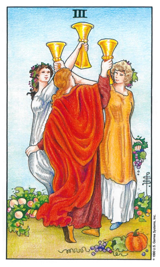 특히 '유니버셜 웨이트 타로' 덱의 컵 3번은 이 모든 즐거움을 더욱 생생하게 그려내고 있답니다."