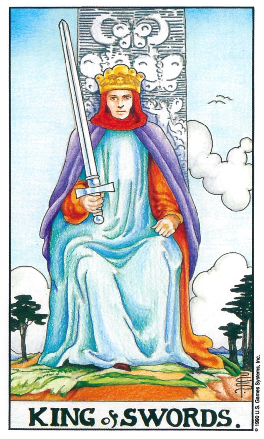 색깔: 왕의 푸른색 옷은 냉철한 이성, 지성, 그리고 평정심을 나타내고, 보라색 망토는 권위와 영적인 지혜를 상징해요. 붉은색 머리카락과 노란색 왕관은 활력과 지혜, 그리고 통치력을 보여줍니다.