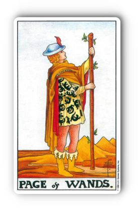 완드 시종 카드를 보면, 화려하고 이국적인 옷을 입은 젊은 시종이 한 손에 싹이 돋아나는 완드를 들고 서 있고, 다른 한 손은 허리에 얹은 채 어딘가를 주시하고 있죠? '시종(Page)'은 메신저, 학생, 또는 어린아이를 상징하며, 새로운 시작과 잠재력을 의미해요. 완드 슈트는 열정, 창의성, 모험, 그리고 행동을 나타내고요.
