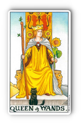 이 카드는 마치 우리가 자신감 넘치고 독립적이며, 자신의 열정과 창의성을 당당하게 표현할 때를 보여줘요. 여왕이 들고 있는 완드는 그녀의 열정과 영감을, 해바라기는 밝고 긍정적인 에너지, 풍요로움, 그리고 타인의 시선을 즐기는 모습을 상징합니다. 그녀의 발치에 있는 검은 고양이는 직관, 신비로움, 그리고 독립적인 성격을 나타내기도 해요.