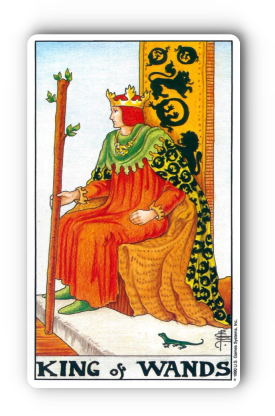 완드 왕 카드를 보면, 위엄 있는 왕이 옥좌에 앉아 한 손에는 싹이 돋아나는 완드를 들고 정면을 응시하고 있죠? 그의 옥좌에는 사자 문양과 도마뱀 문양이 새겨져 있고, 발치에는 작은 도마뱀이 있습니다. '왕(King)'은 성숙한 남성성, 권위, 리더십, 그리고 통치력을 상징해요. 완드 슈트는 열정, 창의성, 모험, 그리고 행동을 나타내고요.