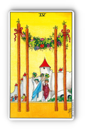 "유니버셜 웨이트 타로의 완드 4번 카드를 보면, 네 개의 지팡이가 튼튼하게 세워져 아치형을 이루고 있고, 그 아래에서 한 쌍의 남녀가 손에 꽃다발을 들고 서로를 향해 환영하는 듯한 모습을 하고 있어요. 멀리로는 성이 보이고, 사람들이 행복하게 모여 축제를 즐기는 듯한 풍경입니다. 마치 결혼식이나 성대한 파티 현장 같지 않나요?