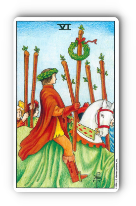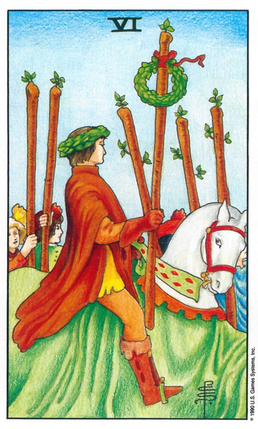 "유니버셜 웨이트 타로의 완드 6번 카드를 보면, 한 기사가 월계관을 쓰고 지팡이를 든 채 백마를 타고 당당하게 행진하고 있어요. 그의 지팡이에는 월계관이 걸려 있고, 주변에는 사람들이 모여 그를 환영하며 박수갈채를 보내고 있습니다. 마치 올림픽에서 금메달을 따고 개선 행진을 하는 선수 같지 않나요? 🏅