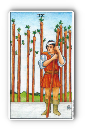 - 숫자/상징: '9'라는 숫자는 완성과 성취를 의미하지만, 여기서는 그 마지막 단계에서 오는 시험과 과제를 나타냅니다. 남자가 들고 있는 하나의 지팡이는 그의 마지막 보루이자 끈기를 상징하며, 뒤에 세워진 8개의 지팡이는 그가 이전에 겪었던 경험과 싸워 이겨낸 역경들을 의미해요.