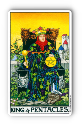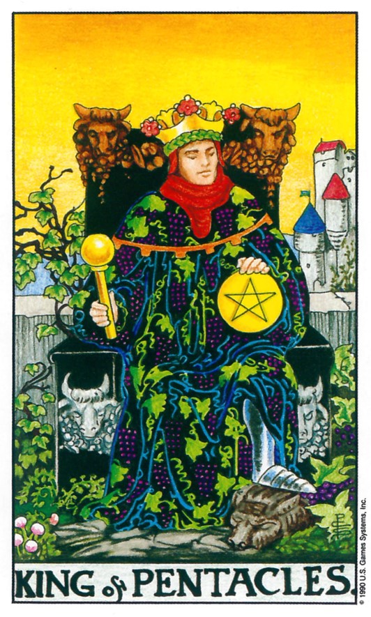 펜타클 왕 카드를 보면, 풍요롭고 견고한 옥좌에 한 왕이 앉아 한 손에는 황금 펜타클(동전)을, 다른 한 손에는 왕홀을 들고 있죠? 그의 옥좌는 포도넝쿨과 황소 머리로 장식되어 있고, 발치에는 포도송이가 놓여 있습니다. '왕(King)'은 성숙한 남성성, 권위, 리더십, 그리고 통치력을 상징해요. 펜타클 슈트는 물질, 돈, 직업, 건강, 그리고 현실적인 것을 나타내고요.