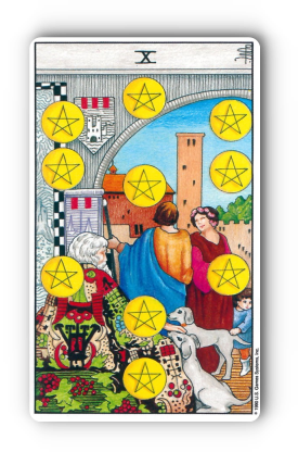 이 카드 속에는 한 가족의 모습이 그려져 있습니다. 늙은 남자가 펜타클 문양의 망토를 걸치고 개 두 마리와 함께 앉아 있고, 그 뒤로는 젊은 부부와 아이가 아치형 문을 통해 들어오는 모습입니다. 이들을 둘러싸고 10개의 펜타클이 안정적인 구도로 배열되어 있으며, 배경에는 번성한 마을의 모습이 펼쳐져 있습니다.