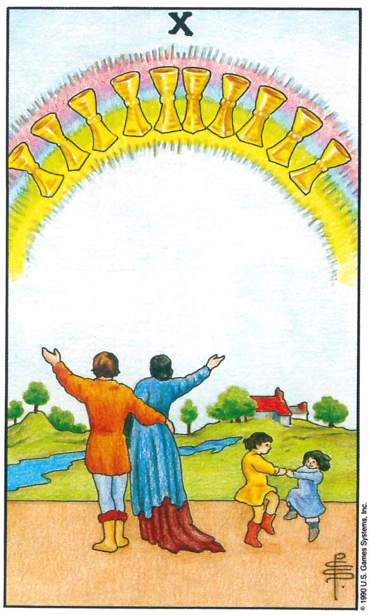"유니버셜 웨이트 타로의 컵 10번 카드를 보면, 한 남녀가 서로 팔을 감싸 안고 뒤에서 아이 두 명이 즐겁게 춤을 추고 있어요. 그들 위로는 무지개 모양으로 10개의 컵이 가지런히 놓여 있고, 배경에는 평화로운 시골 마을이 펼쳐져 있죠. 마치 동화책 속 한 장면을 보는 것 같아요! 🏡