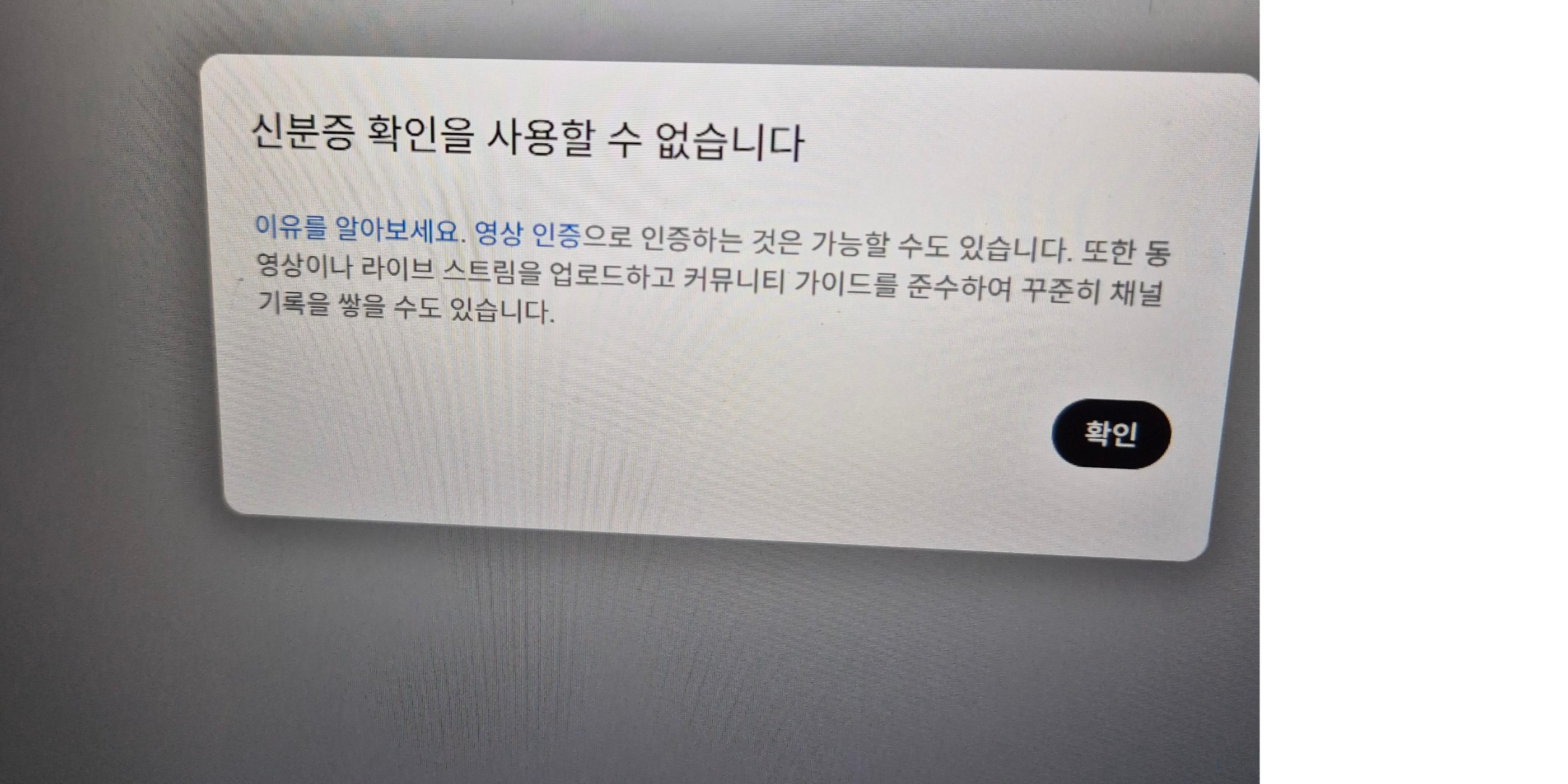 첨부해주신 이미지에는 **"신분증 확인을 사용할 수 없습니다"**라는 메시지와 함께 **"영상을 인증하는 것은 가능할 수도 있습니다. 또한 동영상이나 라이브 스트림을 업로드하고 커뮤니티 가이드를 준수하여 꾸준히 채널 기록을 쌓을 수도 있습니다."**라는 안내가 보입니다.