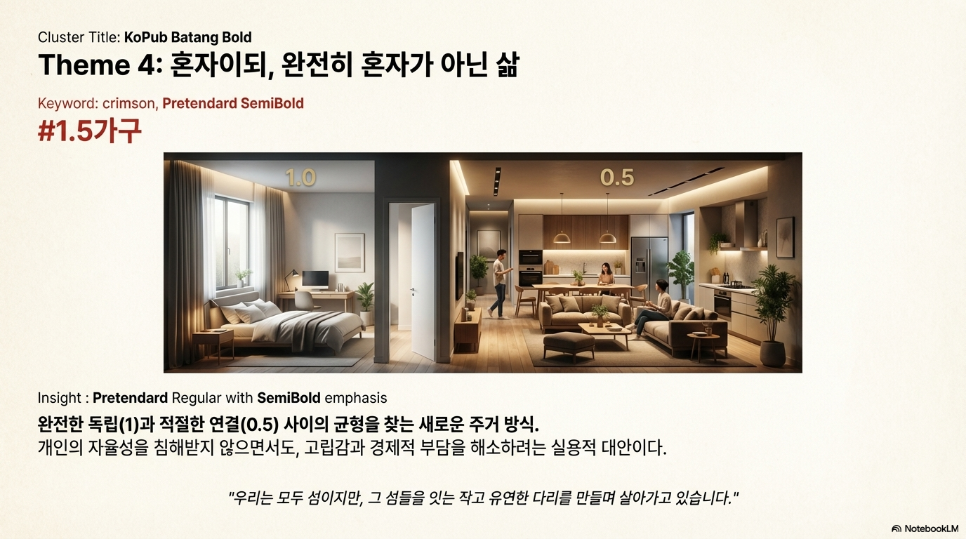 완전한 독립(1)을 추구하면서도, 외로움과 경제적 부담을 해소하기 위해 적절한 수준의 연결감(0.5)을 유지하려는 새로운 생활 방식, ‘1.5가구’가 등장했습니다.
